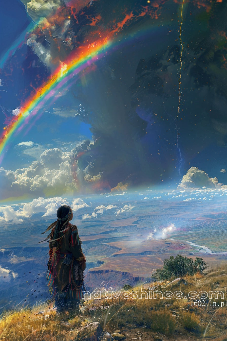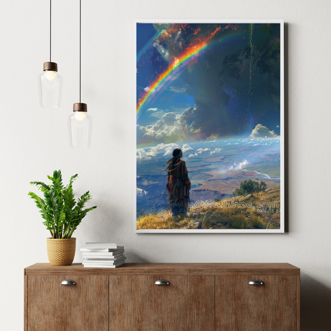 Experience the power and beauty of Native American culture with this breathtaking artwork, depicting a warrior standing proudly beneath a vibrant rainbow. The vast landscape stretches out before him, symbolizing the connection between the earth and sky, while the rainbow serves as a sign of hope, unity, and ancestral blessings. His traditional attire and serene presence reflect deep wisdom and honor, a tribute to the enduring legacy of Native people. Printed on high-quality, durable canvas, this masterpiece brings both beauty and meaning to any space. Embrace the spirit of strength and resilience with this Native American Canvas – order now.