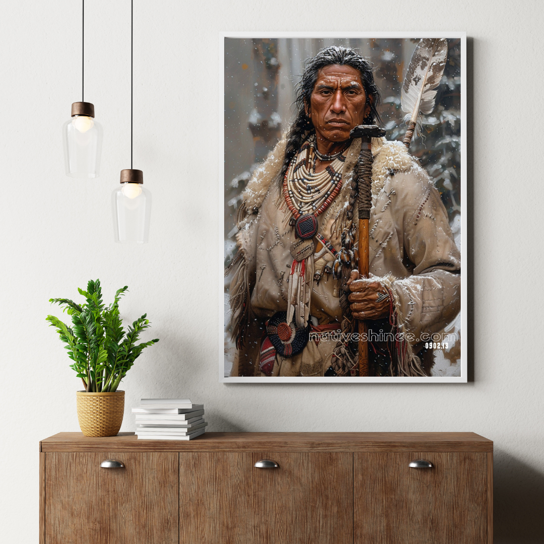 Experience the fierce strength and profound wisdom of Native American heritage with Warrior of the Snow Native American Canvas. This powerful artwork captures a Native American warrior standing tall in a snow-covered landscape, his determined gaze reflecting both the harshness of winter and the resilience of his spirit. His intricate beadwork and traditional attire speak to his deep connection with his ancestors and the land. The snowflakes resting on his clothing symbolize the enduring strength of the warrior through adversity. Printed on high-quality durable canvas, this masterpiece brings a commanding presence to any space. Celebrate the spirit and bravery of Native warriors—order now