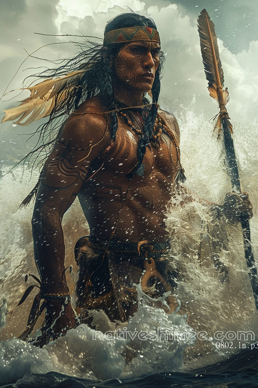 Dive into the spirit of the warrior with this striking canvas art, Warrior of the Waves Native American Canvas. The image portrays a Native American warrior standing tall in the midst of crashing waves, his body adorned with traditional tattoos and jewelry. With a spear in hand and feathers in his hair, he embodies the strength, resilience, and connection to nature that is central to Native American culture. The powerful scene, set against a dramatic sky and turbulent water, evokes a sense of determination and courage, making it an ideal addition to any collection that celebrates Native American heritage and the untamed beauty of nature.