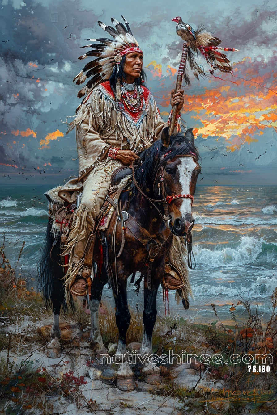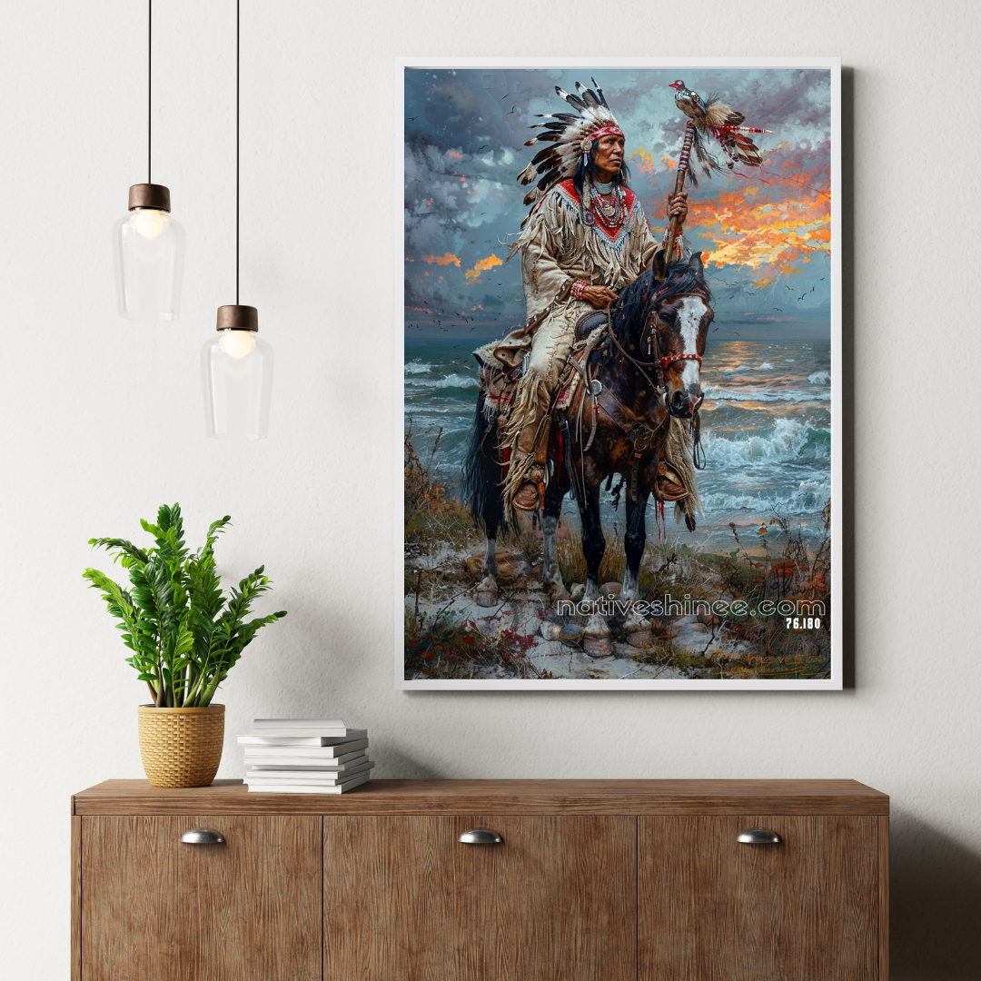 Feel the strength and spirit of Native American heritage with Warrior of the Winds Native American Canvas. This stunning artwork captures a proud Native American warrior riding a noble horse along the coast, his gaze fierce and unyielding as he stands tall against the dramatic sky. The feathers in his headdress, the vibrant colors of his attire, and the powerful symbolism of the bird perched on his staff reflect his deep connection to nature, the earth, and the spirits of the wind. The stormy backdrop and the waves crashing along the shore speak to his resilience and enduring spirit. Printed on high-quality durable canvas, this masterpiece brings the raw beauty and power of Native culture into your space. Own a piece of this timeless legacy—order now.