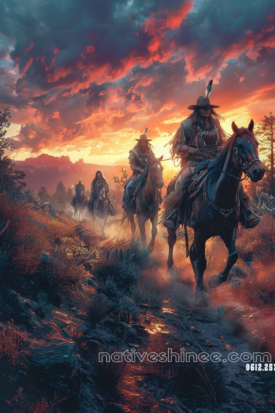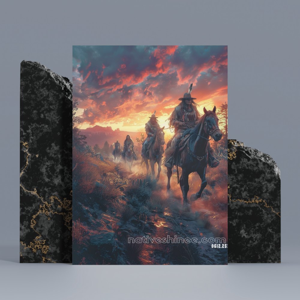 This captivating canvas depicts a powerful scene of Native American warriors riding across the land at sunset. The warm, golden hues of the sky contrast beautifully with the dark silhouettes of the riders, creating an atmosphere of adventure, freedom, and resilience. The horses gallop through the rugged terrain, leaving trails of dust behind them, while the warriors, adorned in traditional attire and headdresses, move with purpose and strength. The vivid colors of the sunset illuminate the landscape, adding to the feeling of triumph and unity with nature. This artwork is a tribute to the spirit and perseverance of the Native American people, as they navigate their journey through both challenges and beauty.