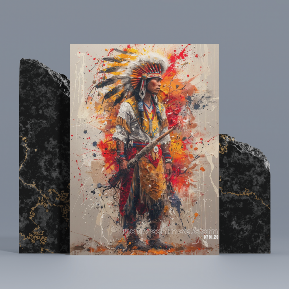 Warrior's Flame embodies the fierce spirit and courage of Native American warriors. This stunning canvas art features a powerful figure dressed in traditional regalia, complete with an intricate feathered headdress and a richly adorned outfit. The backdrop bursts with fiery colors of red, orange, and yellow, symbolizing the strength and passion that courses through the warrior's veins. The intricate details, from the beaded necklaces to the painted chest, exude a sense of pride and honor. This artwork captures the essence of resilience, battle, and the profound connection to the land and heritage. The warrior stands tall, his gaze unwavering as he faces the future with the fire of determination burning in his heart