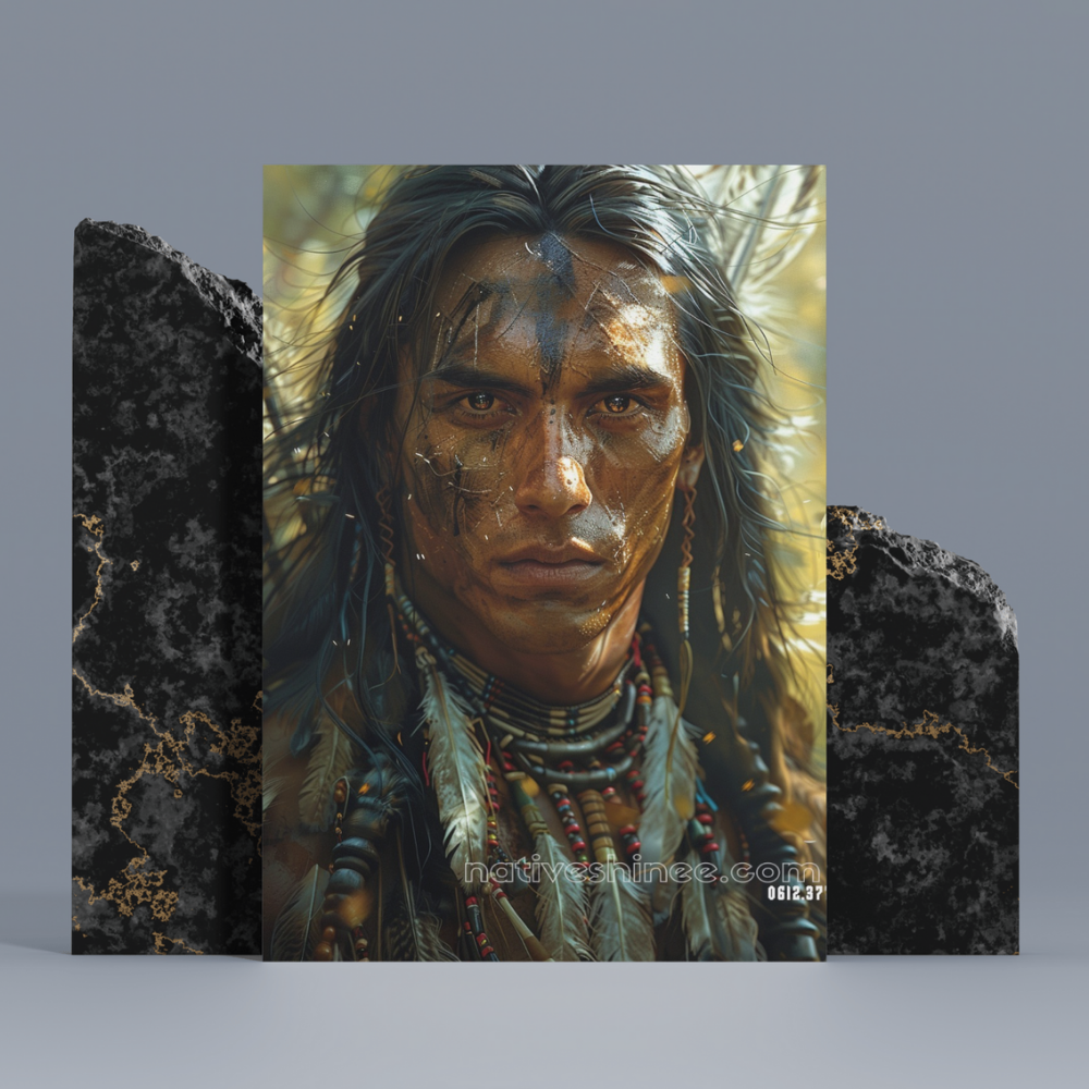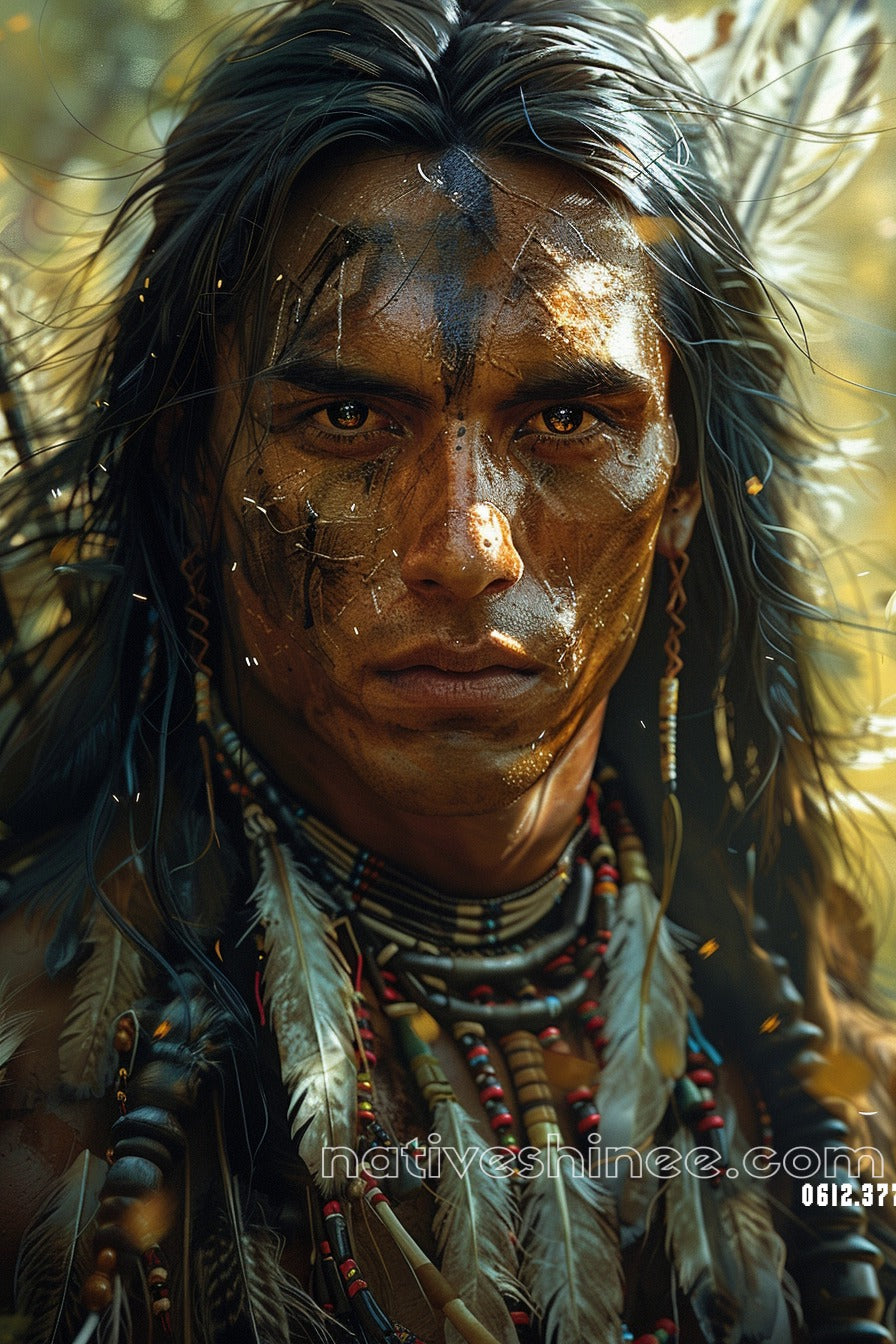 This striking canvas captures the intense gaze of a Native American warrior, his face adorned with ceremonial paint symbolizing strength and connection to the spirit world. The intricate details of his traditional attire, decorated with beads and feathers, reflect his deep cultural heritage and warrior spirit. Illuminated by the soft glow of sunlight filtering through the forest, his piercing eyes convey a powerful story of resilience and reverence for nature. This artwork encapsulates the essence of a guardian bound by tradition, wisdom, and unyielding courage.