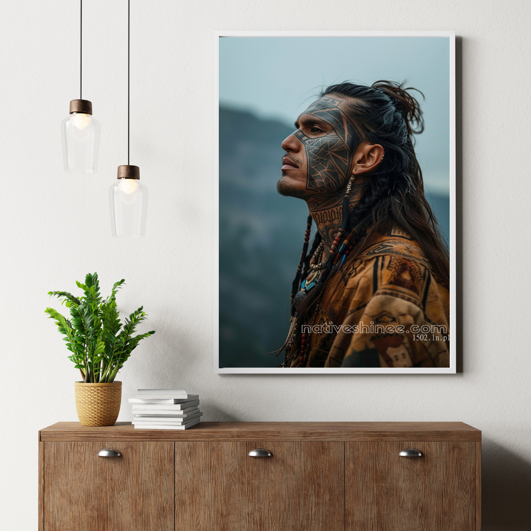 Embrace the strength and legacy of Native culture with Warrior's Gaze Native American Canvas. This stunning artwork captures the powerful and serene image of a Native American warrior with intricate face tattoos, standing tall in the embrace of nature. His fierce yet peaceful expression, adorned with feathers and beads, speaks to the rich heritage, resilience, and deep spiritual connection with the land. Printed on premium, durable canvas, this piece brings history and artistry together, making it a perfect addition to any home décor or a meaningful gift. Embrace the spirit of the Warrior and own a timeless piece of Native heritage – order now.