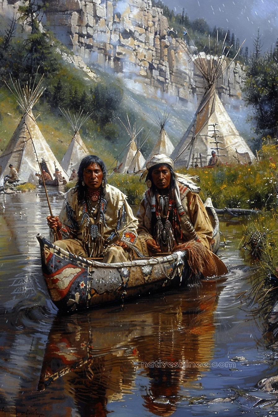 Warriors Navigate Peaceful Waters in Canoe Native American Canvas
