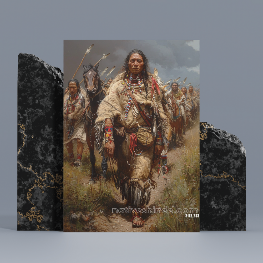 Warrior's Path depicts a powerful moment in Native American history, where a group of fierce warriors, adorned with intricate beadwork and feathers, move forward with purpose and determination. At the forefront is a stoic leader, his eyes fixed ahead, surrounded by his people who share his strength and resolve. Mounted on horses and armed with spears, the warriors march through the wilderness, ready to protect their land and culture. This canvas art captures the unity, resilience, and undying spirit of the indigenous peoples. Perfect for those who want to honor the courage, legacy, and warriors of Native American heritage.