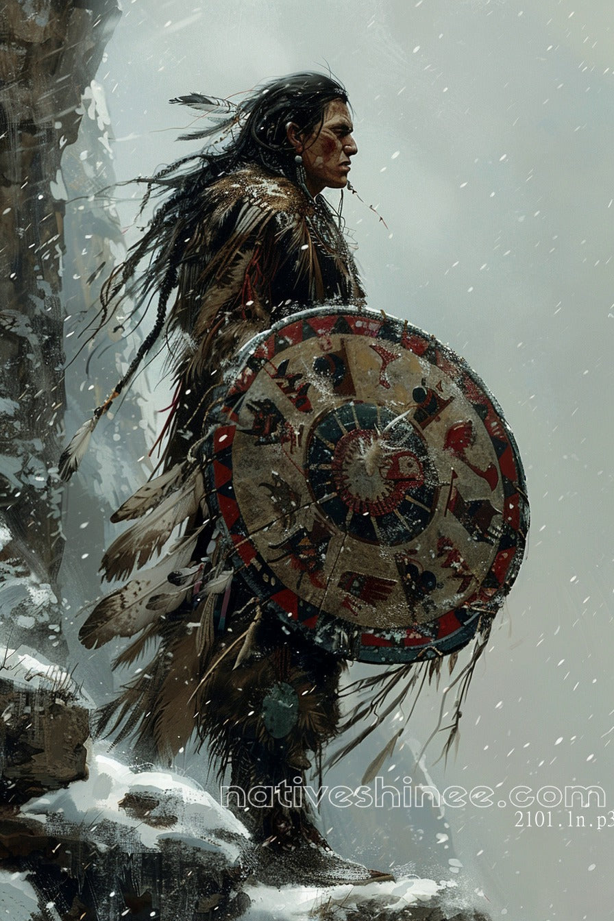 Embrace the power and resilience of Native American heritage with the Warrior's Resolve Native American Canvas. This striking artwork features a warrior standing steadfast against the elements, his gaze focused and determined. With his shield adorned in traditional art and feathers, he represents the strength and unwavering resolve of his people. The snowy mountain backdrop adds to the sense of solitude and bravery, evoking the spirit of a true warrior. Perfect for those who admire Native American culture, this canvas piece brings the legacy of courage, honor, and tradition into any space. Enhance your home with this bold and inspiring portrayal.