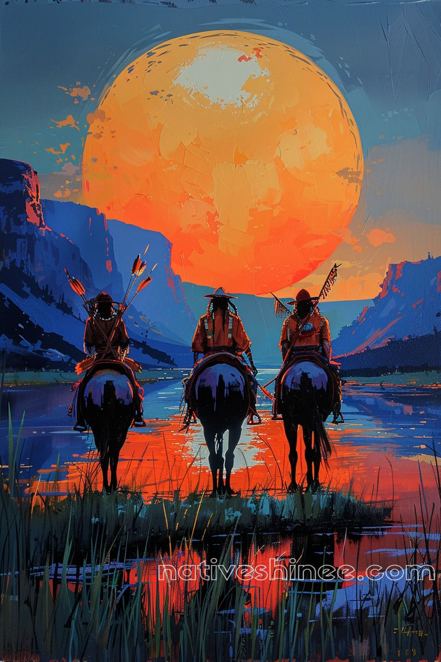 Warriors Silhouetted Against a Full Moon Native American Horse Canvas