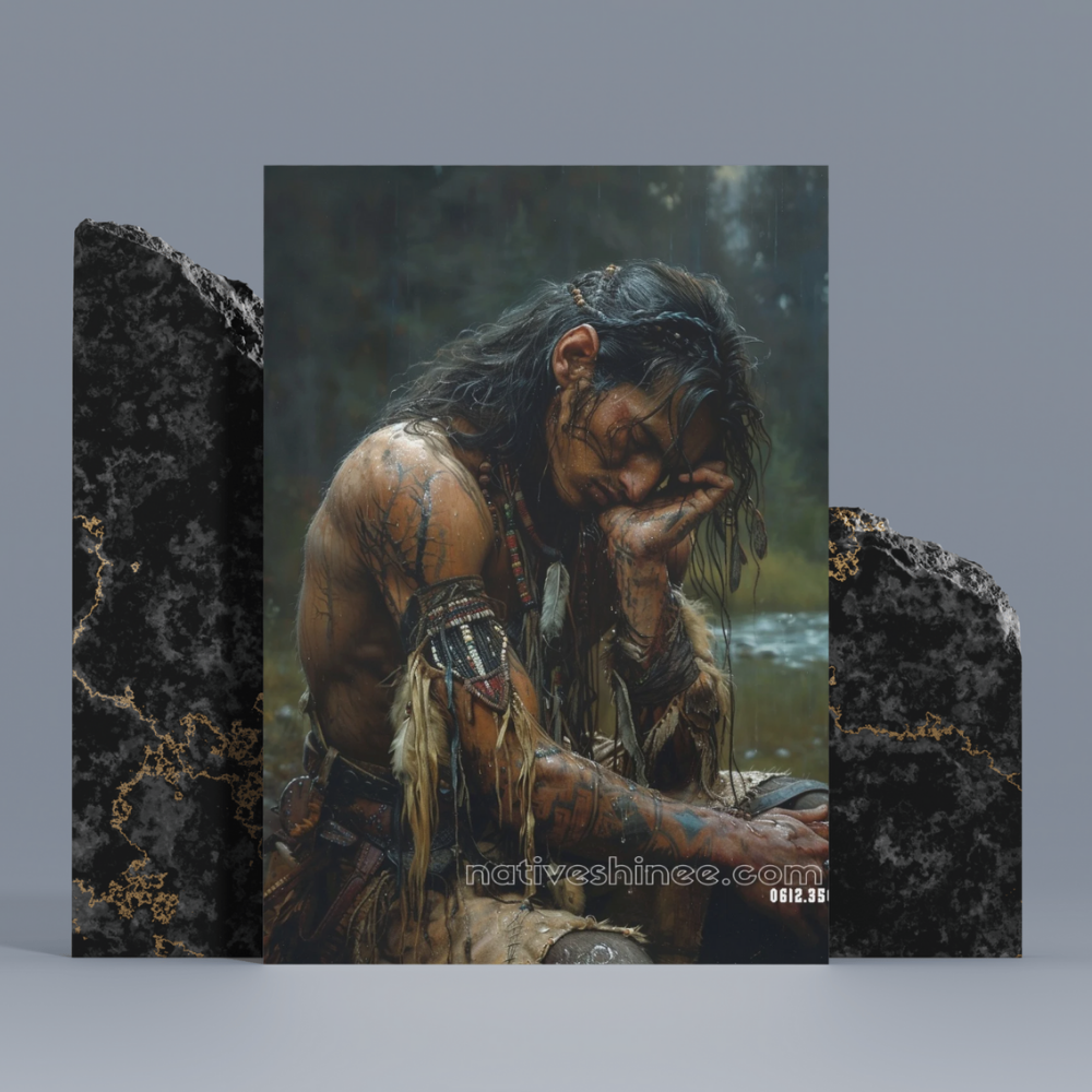 This powerful artwork captures a profound moment of solitude, strength, and emotional depth. A Native American warrior sits alone, in the midst of a rainstorm, his head bowed, and his face covered by one hand. The wetness from the rain clings to his skin, mixing with the earth and the tattoos on his body, which tell stories of his tribe and his journey. His attire, rich in beads and feathers, reflects his deep connection to his heritage. The somber atmosphere in the forest, with the blurred background of trees, emphasizes the weight of the moment and the internal struggle he faces. His posture, vulnerable yet resilient, conveys a raw emotion of deep contemplation and solitude.