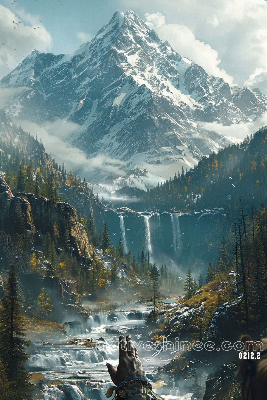 Whisper of the Sacred Falls portrays the profound connection between the Native American spirit and the natural world. In the foreground, a hand reaches towards the magnificent landscape, adorned with intricate bracelets that symbolize strength and connection to the Earth. The towering, snow-capped mountains stand majestically in the background, while the cascading waterfalls below evoke the purity and power of the land. The dense forest, lush with trees, and the drifting mist lend a sense of mystery and reverence to the scene.