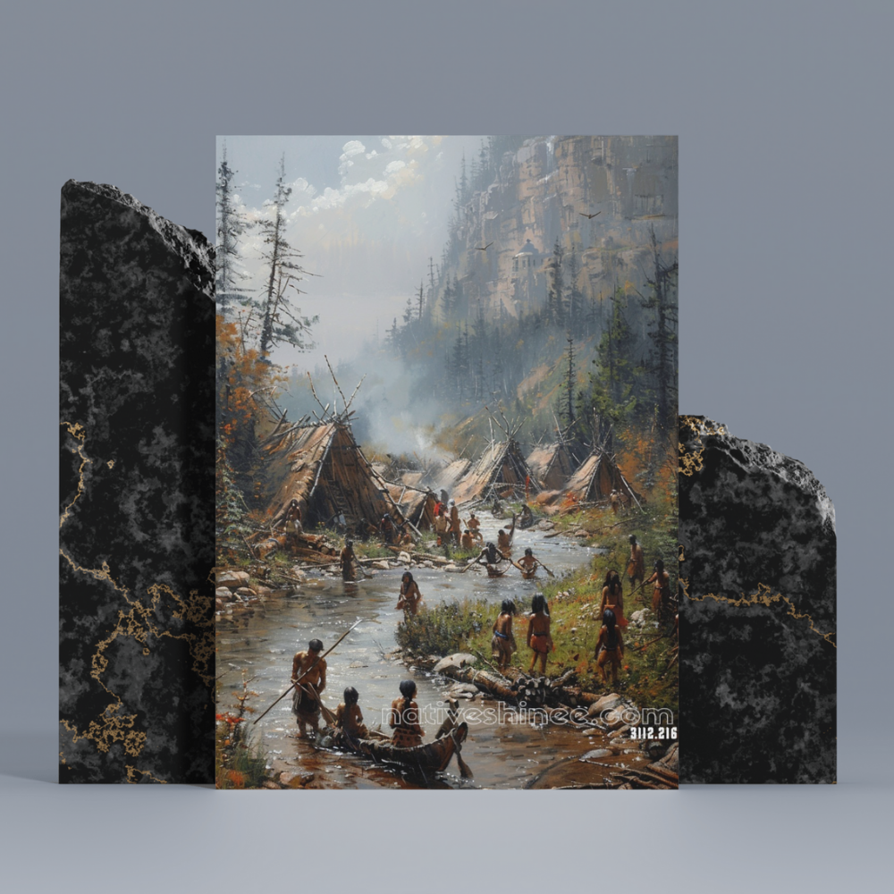 This powerful piece captures the essence of Native American life by the river. The scene is set in a tranquil yet industrious camp nestled between towering cliffs, with families and individuals engaged in various activities. Canoes glide along the river, carrying people and goods, while others gather and maintain the communal space. The smoke rising from the tepees tells the story of a vibrant, connected community, thriving in harmony with nature. The vivid landscape is highlighted by the surrounding forest and the sky's gentle clouds, offering a moment of serenity and strength.