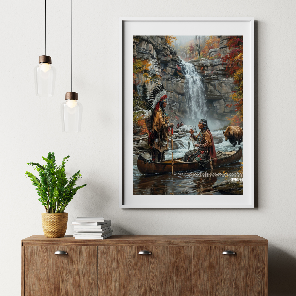Two Native American figures stand near a canoe, exchanging wisdom amidst the thunderous sound of a cascading waterfall. Dressed in intricate beadwork and traditional attire, their connection is evident, while a watchful bear lingers in the serene autumn forest. This captivating scene embodies the unity of culture and nature, a moment of harmony and respect for the land.