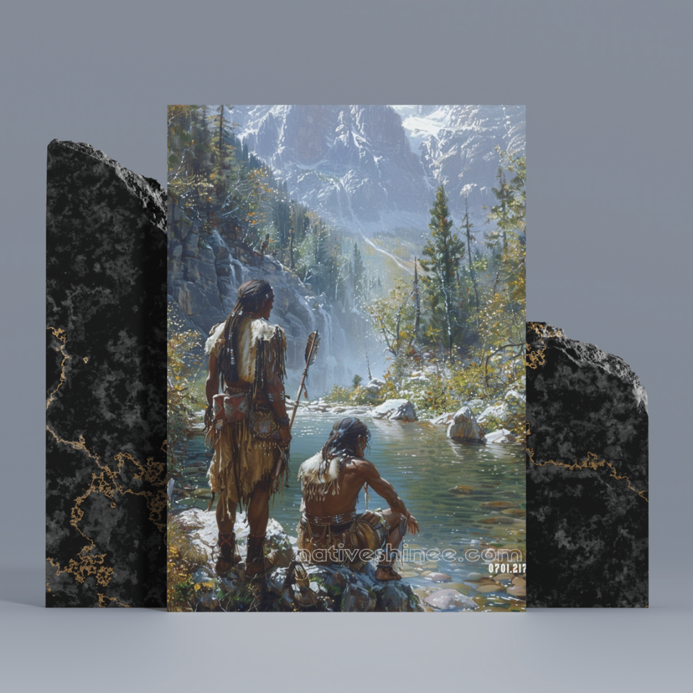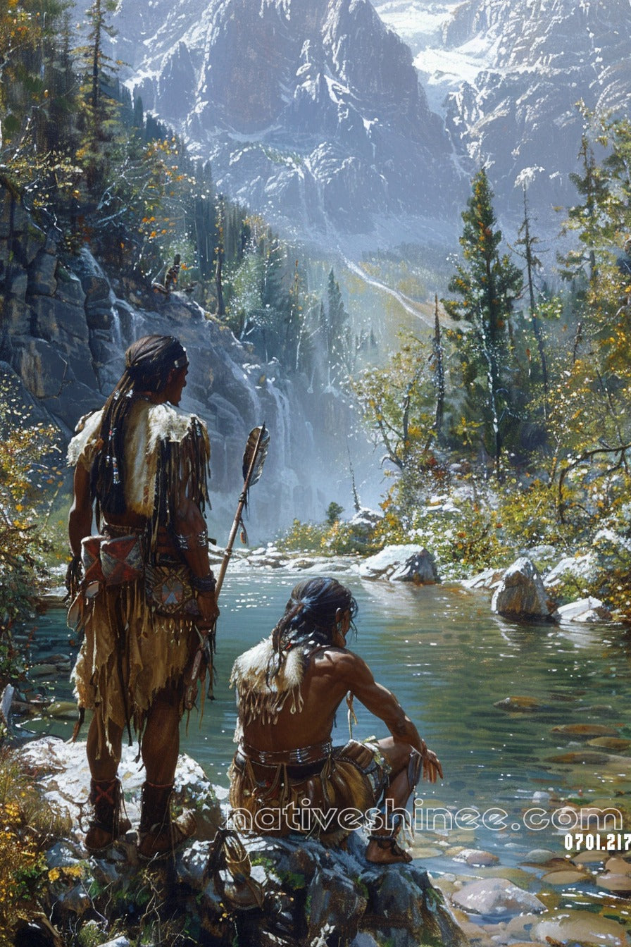 This captivating scene captures two Native American men in a moment of reflection amidst the untouched beauty of the wilderness. They stand by a crystal-clear river, its surface shimmering in the soft light of the mountain sun. In the foreground, one man is seated by the water's edge, deeply immersed in the tranquility of nature, while the other stands, poised and watchful, like a guardian of the land. Their traditional attire, marked by intricate beadwork and feathers, tells a story of their deep connection to their heritage.