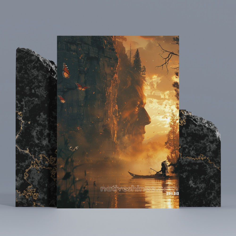 A lone canoe glides across a serene river, bathed in the amber glow of a setting sun. The cliffside towers above, etched with the faint visage of an elder's face, as if the earth itself remembers the wisdom of the past. Monarch butterflies flutter gently, embodying the spirits of those who have come before, dancing in the golden haze of dusk. This evocative scene captures the profound connection between nature, memory, and the enduring spirit of Native American heritage.