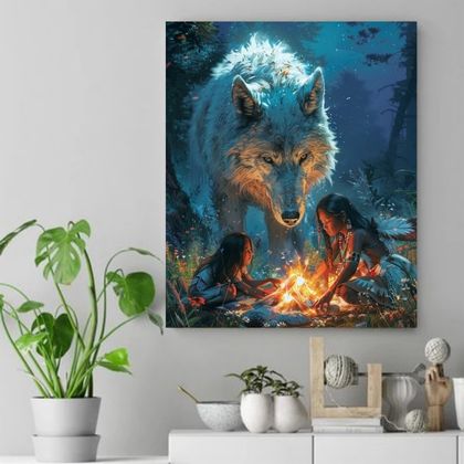 This captivating canvas artwork portrays the mystical connection between the Native American people and the natural world. The figure, adorned in traditional attire and standing strong in the wilderness, seems to listen to the whispers of ancestors carried on the wind. The soft hues of earth and sky blend together, creating a peaceful, almost spiritual atmosphere that honors the wisdom of the past. The flowing lines and serene expression convey a sense of deep respect for the land and the ancient traditions that continue to guide the Native American way of life. This piece serves as a timeless tribute to their enduring legacy.