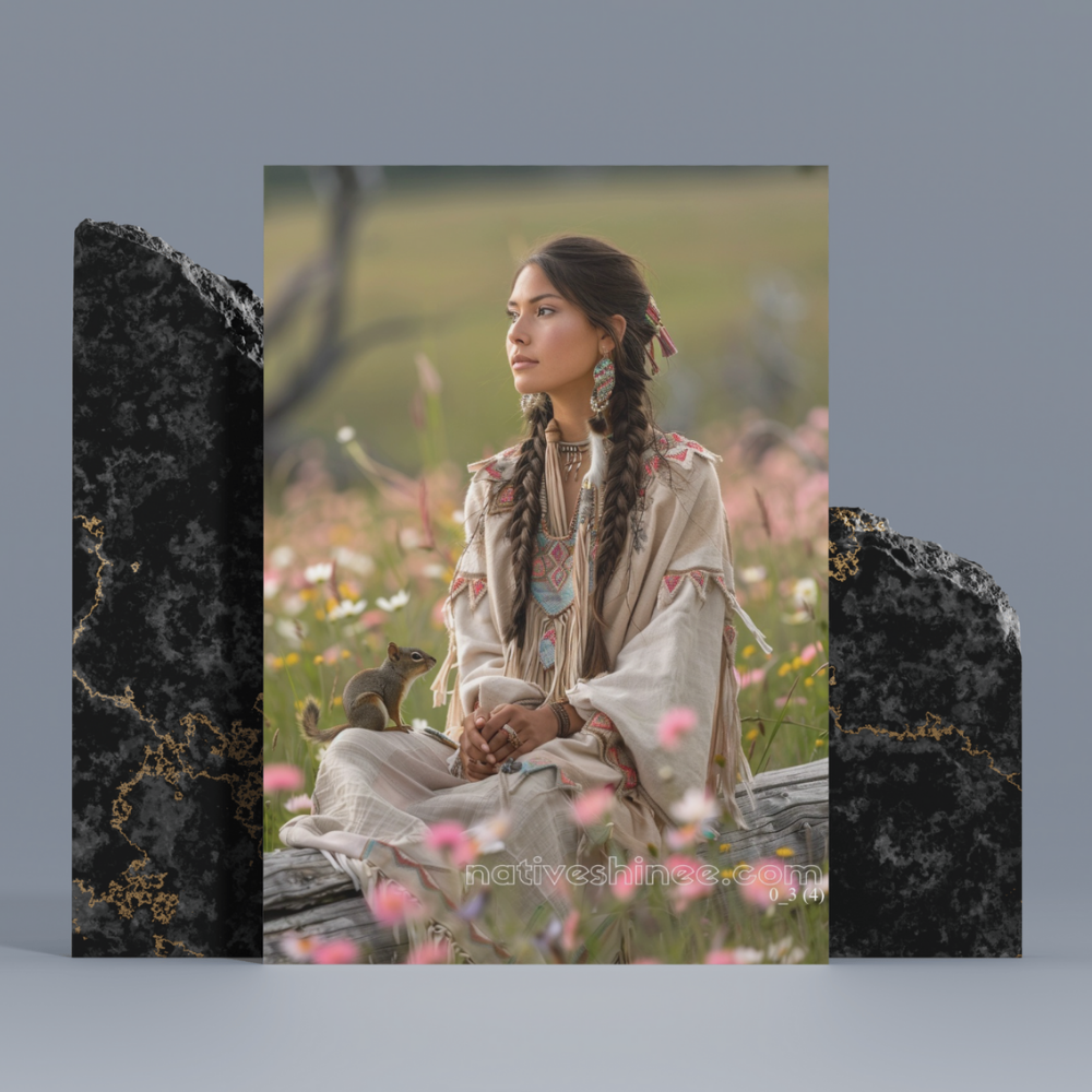 Whispers of the Meadow beautifully captures a moment of quiet contemplation as a young Native American woman sits gracefully among a field of wildflowers. With her braided hair and traditional attire, she is a living testament to the strength and beauty of her culture. A small squirrel rests at her side, embodying the gentle harmony between humankind and nature. The soft colors of the meadow and the peaceful expression on her face reflect a deep connection to the earth, where every breath is in rhythm with the land. This tranquil scene, brought to life by Native American Canvas, invites you to pause, reflect, and appreciate the natural world