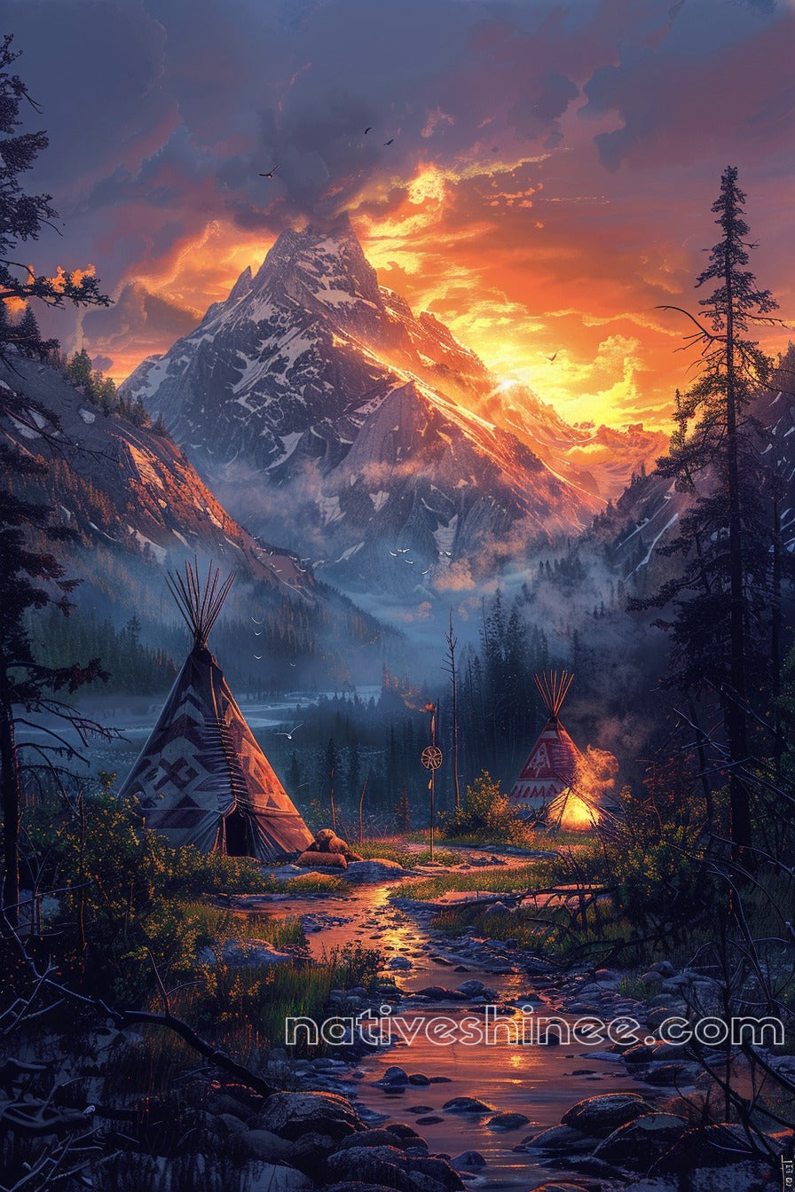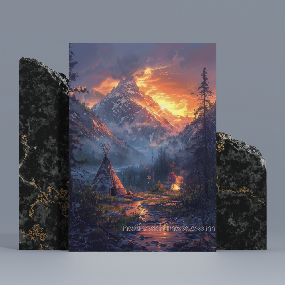 Immerse yourself in the quiet power of nature with this breathtaking scene of a Native American village beneath the mighty mountains. As the sun sets behind snow-capped peaks, the warmth of the campfires contrasts with the cool mist rising from the river. This canvas evokes the deep connection between the people and the land, capturing a moment of serenity, strength, and timeless beauty. Perfect for adding a touch of rugged elegance to your home.