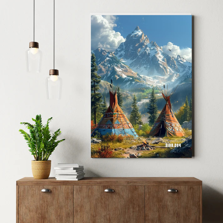 “Whispers of the Mountain Spirits” is a breathtaking portrayal of serenity and harmony within nature’s grand design. The artwork features two traditional tipis nestled in a lush alpine valley, surrounded by evergreens and radiant autumn foliage. Towering above, majestic snow-capped peaks rise into the sky, their grandeur softened by drifting clouds and sunlight filtering through the crisp mountain air. The composition captures the deep connection between the land and its people—a reminder of balance, respect, and reverence for the natural world. Each brushstroke conveys tranquility and timelessness, while the vibrant colors evoke a sense of renewal and freedom. The tipis, adorned with intricate tribal patterns, symbolize community, protection, and the enduring bond between humanity and the earth. Ideal for any space, this canvas invites reflection, grounding, and a quiet appreciation for life’s simple yet profound beauty—where the spirit of the mountains whispers stories of peace and belonging.