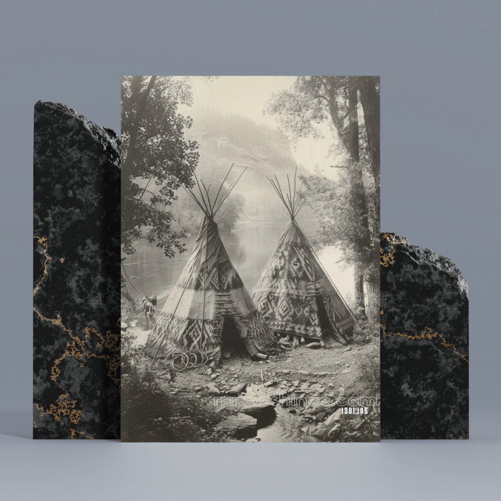 Whispers of the Past Native American Canvas captures the serene beauty of a traditional Native American camp, nestled by a tranquil river. The iconic teepees, adorned with intricate patterns, stand tall in the misty morning light, surrounded by the lush forest and towering cliffs in the distance. A lone figure on horseback is seen in the foreground, symbolizing the connection between the people and the land they call home. The timeless black-and-white photo emphasizes the quiet strength and enduring presence of Native American culture, honoring their deep connection to nature and their heritage. Perfect for those who appreciate history, tradition, and the enduring spirit of Native peoples