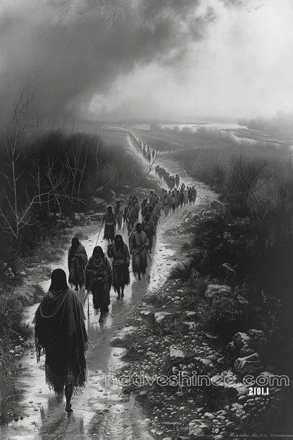 This evocative canvas captures a profound moment in history, portraying a line of Native Americans on the long and painful journey known as the "Trail of Tears." The image is a haunting reminder of the suffering, endurance, and resilience of the indigenous peoples as they were forcibly relocated from their ancestral lands. The figures march solemnly, cloaked in the shadows of their past, on a winding path that stretches into the mist. Their faces, though solemn and distant, reflect the unbroken spirit of a people determined to survive despite the adversity and hardships they faced. The eerie, mist-filled atmosphere invokes both sorrow and strength, honoring the sacrifices made by those who walked these paths.
