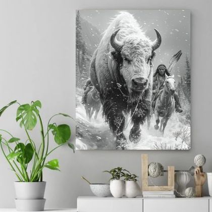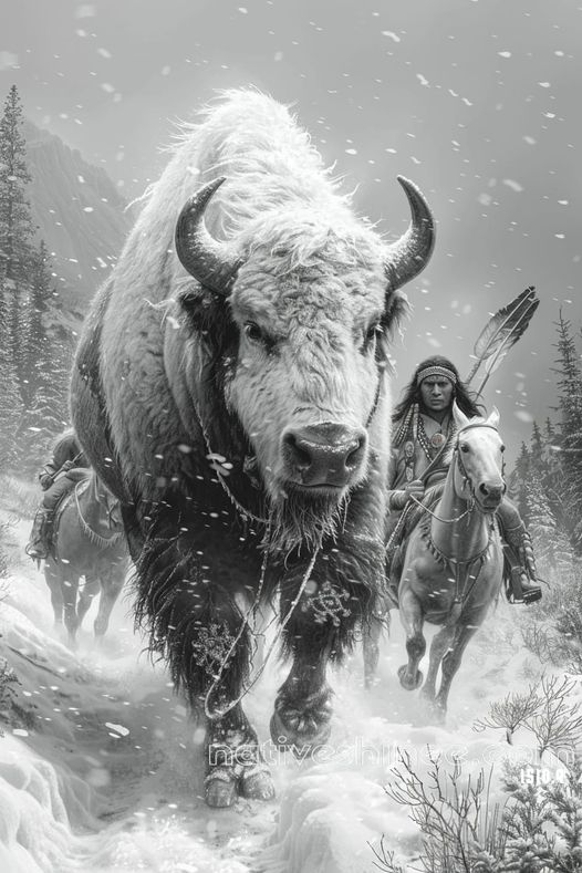 This black-and-white image captures a powerful scene of a majestic white bison, its coat thick and textured, striding through a snowy wilderness. Behind the bison, a Native American rider follows closely, wrapped in traditional attire, with a spear in hand and a calm, resolute expression. The snowflakes dance through the air, creating an ethereal effect around them. The image embodies strength, resilience, and harmony with nature, reflecting the spiritual significance of the white bison in Indigenous culture as a symbol of hope and sacred power. This portrayal of the bison and its guardian evokes a timeless journey through the heart of winter.