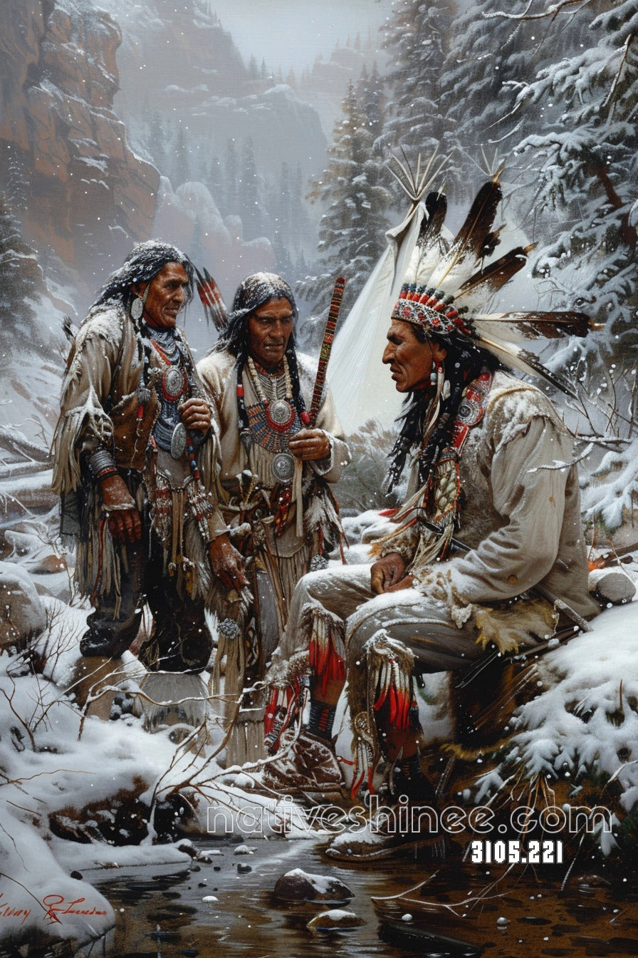 This canvas artwork depicts a serene winter scene featuring three Native American figures adorned in traditional attire, including feathered headdresses and detailed clothing. They are seated in a snowy landscape surrounded by towering pine trees and rugged cliffs, engaged in what appears to be a thoughtful discussion or council. The artwork captures the stark beauty of the snow-covered environment, with soft lighting from hanging pendant lamps adding a warm contrast. The piece is framed and displayed on a wooden console table, accompanied by a lush green plant and a stack of books, enhancing the cozy, contemplative atmosphere.