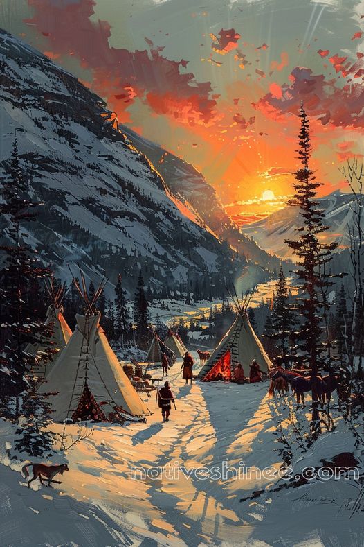 This captivating artwork portrays a tranquil Native American village nestled in a snowy valley, illuminated by the golden hues of a setting sun. The vibrant oranges and reds of the sky contrast beautifully with the pristine white of the snow, creating a heartwarming scene of community and nature. Teepees stand tall amidst the trees, their warm interiors glowing with life as smoke rises from fires within. Figures are seen moving about, their footprints marking paths in the snow, while a dog adds a touch of companionship to the setting. This piece captures the essence of winter serenity and the enduring spirit of community harmony.