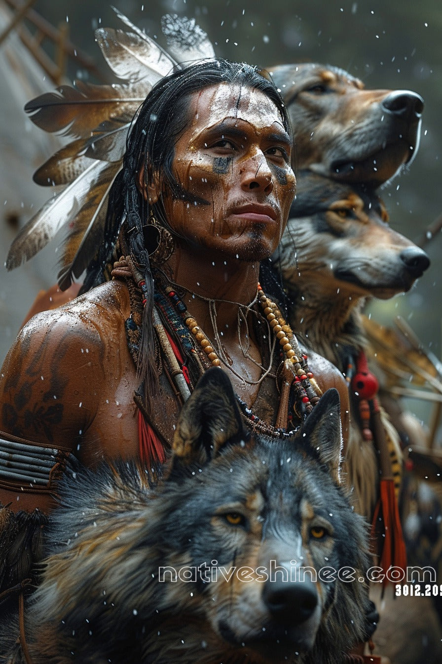Amid swirling flakes and the low growl of wind, a resolute warrior stands with wolves at his side—each of them alert, proud, and bound by an unspoken kinship. Every bead and brush of paint across his skin tells a story of unity, courage, and untamed spirit.