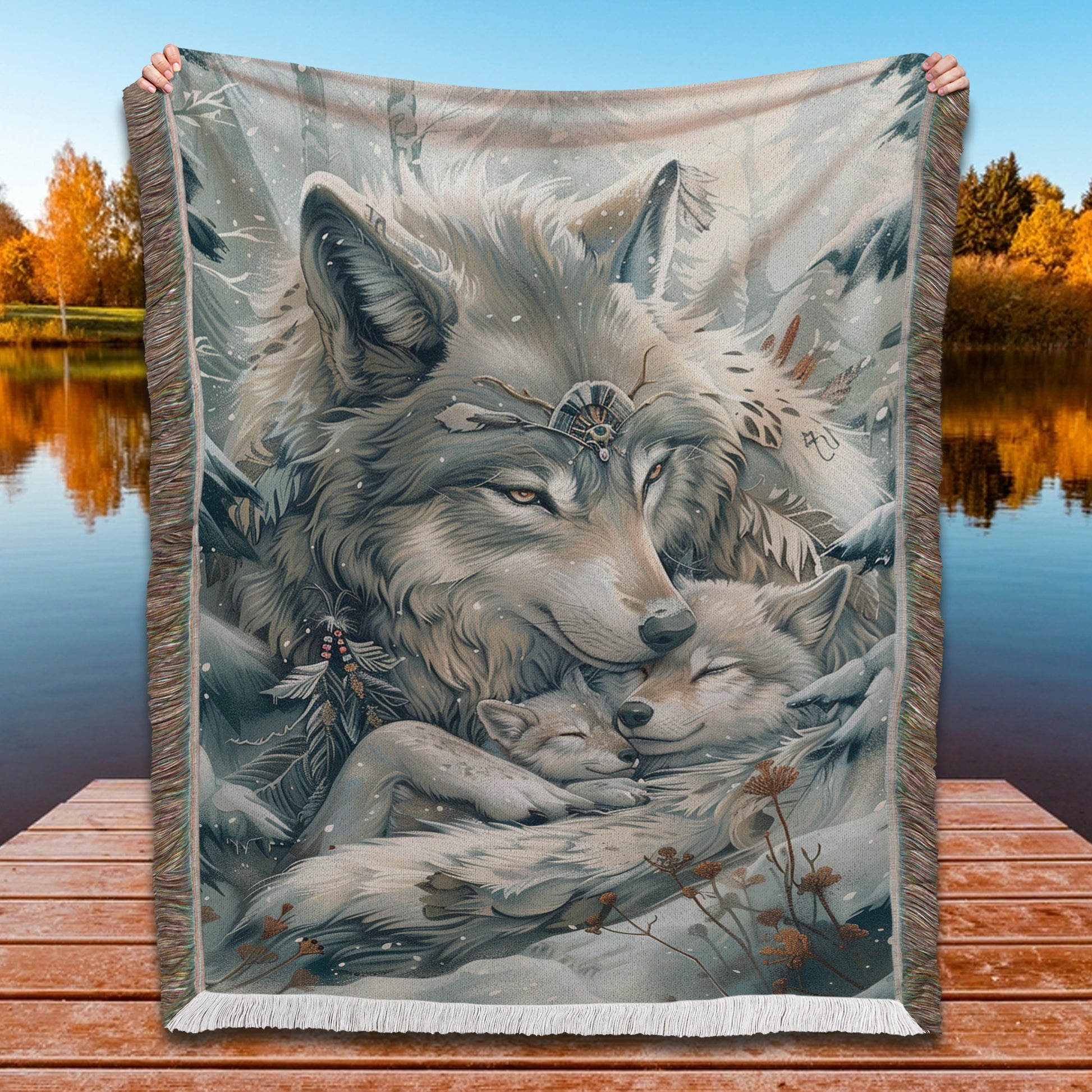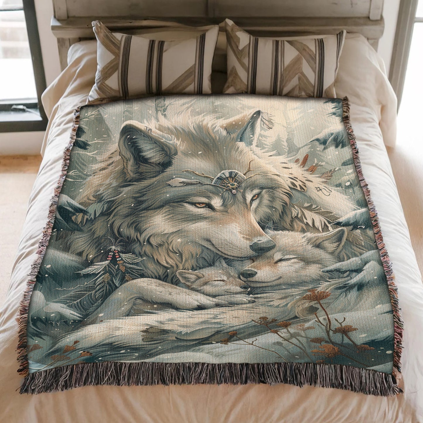 Find warmth in the heart of winter with our Winter Wolf Nest Woven Blanket! This tender throw depicts a wolf and her pups nestled together in a snowy scene, adorned with intricate beaded jewelry and surrounded by cultural elements, creating a bohemian and nurturing atmosphere. Perfect for those who cherish the protective bonds of wildlife and the serenity of winter, this blanket adds a touch of frosty beauty to any space. Crafted from 100% cotton and expertly woven for a soft, breathable, and durable finish, it’s ideal for cozying up on chilly evenings, draping over your couch, or displaying as a meaningful wall tapestry. The fringed edges enhance its rustic charm, making it a versatile piece for both decor and comfort. Wrap yourself in the loving imagery of this wolf family in snow, and let its wintery embrace inspire your cozy moments.