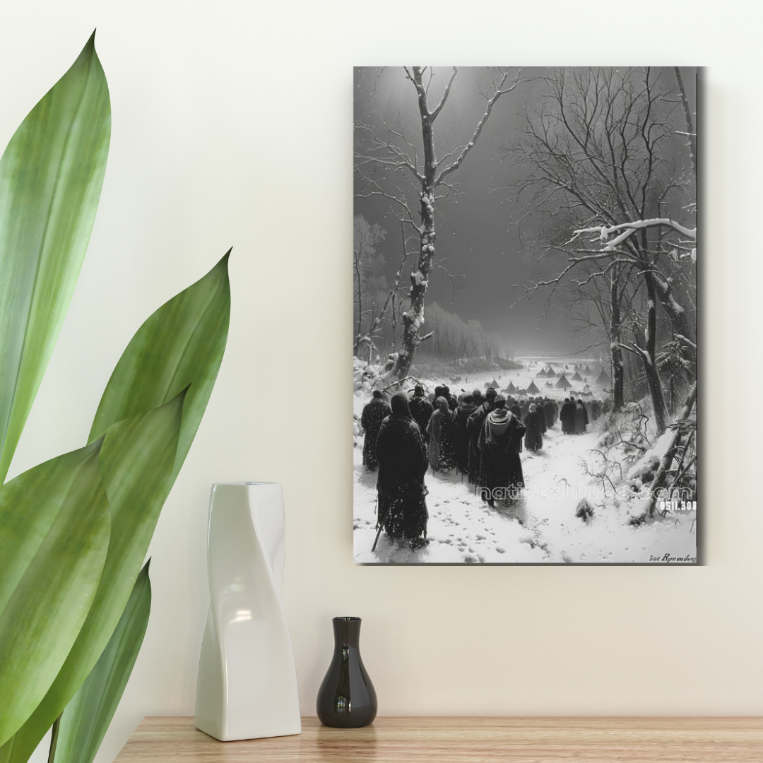 A solemn procession of cloaked figures weaves through a snow-blanketed forest, their path illuminated by a faint, ethereal glow. In the distance, a Native village nestled by the frozen plains awaits under the serene night sky. Winter's Journey to the Village is a hauntingly beautiful Native American Canvas that captures resilience, unity, and the enduring spirit of community in the face of nature's challenges.