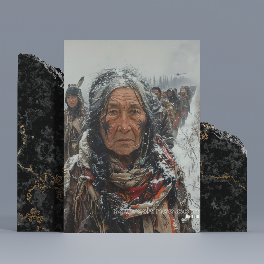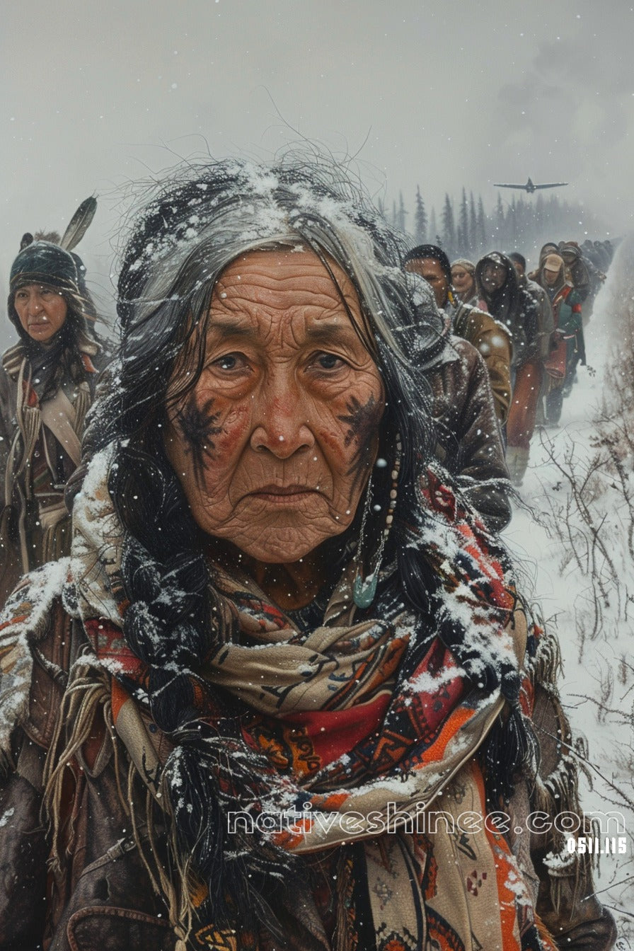 In the midst of a serene, snow-covered landscape, an elderly Native American woman stands as the focal point of the scene. Her long, flowing black hair contrasts sharply against her traditional winter attire, meticulously adorned with intricate patterns that speak to her rich cultural heritage. Her face bears elegant tattoos, each line and symbol telling a story of generations past. Surrounding her are a group of arctic explorers, their heavy gear and layered clothing indicative of their arduous journey toward the Alaskan frontier. The overcast sky casts a muted light over the scene, while gentle rainflakes add a soft sheen to the pristine snow beneath their feet. In the far distance, the stark presence of military vehicles trudges through the endless white expanse, hinting at a broader, perhaps tumultuous, movement across the frozen terrain. The entire tableau exudes a blend of tradition and exploration, resilience and determination, set against the unforgiving beauty of the winter wilderness.