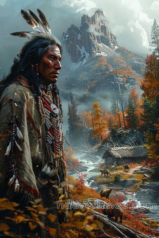 This majestic canvas portrays a Native American elder standing in quiet reflection before a stunning mountain backdrop. The towering peaks and flowing river reflect both the strength and serenity of nature, while the autumn colors add warmth to the landscape. The elder's weathered face speaks of experience, wisdom, and a deep connection to the land. In the background, animals roam freely near a traditional dwelling, further emphasizing the harmony between humanity and nature. This powerful image symbolizes the enduring spirit of the people and their sacred relationship with the natural world that surrounds them.