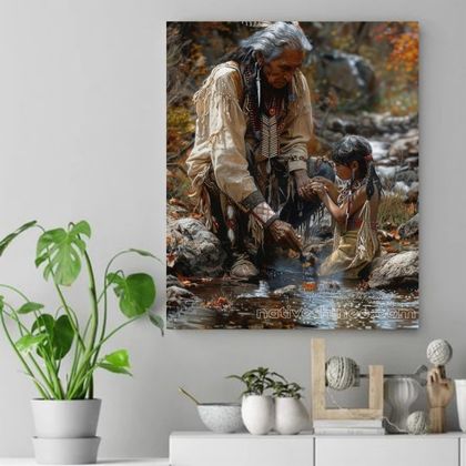 This touching artwork captures a sacred moment between generations, as an elder Native American teaches a young child the spiritual significance of water. Set amidst a vibrant autumn backdrop, the elder gently guides the child's hands toward the reflective surface of a stream, symbolizing the passing down of knowledge, tradition, and respect for nature. Their traditional attire, adorned with beads and feathers, adds cultural depth, while the serene environment evokes peace and connection to the earth. This piece speaks to the importance of heritage, wisdom, and the timeless bond between the old and the young.