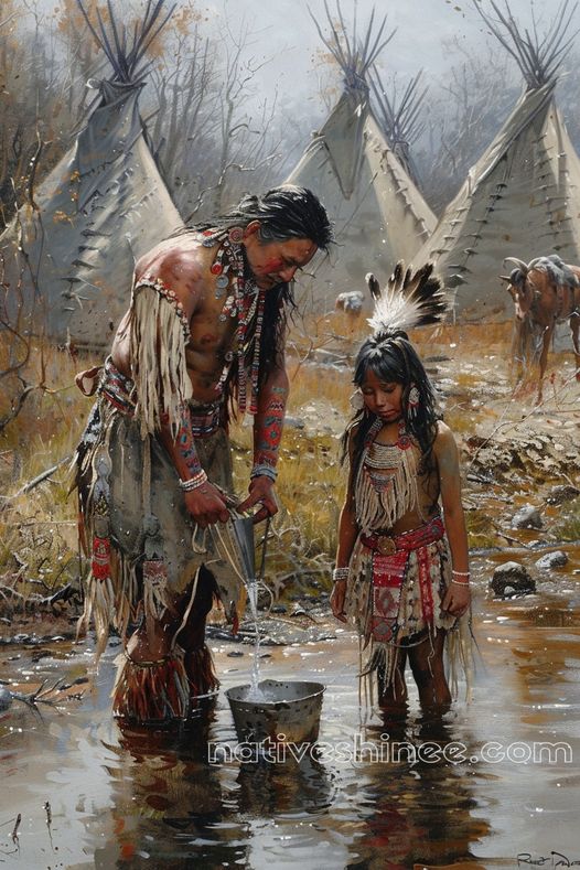 In this heartwarming canvas, a Native American father and his young daughter stand together near the water, surrounded by the tranquil presence of teepees in the background. The father, adorned in traditional clothing, gently pours water into a wooden bucket while imparting valuable life lessons to his child. The young girl, attentively observing, embodies the next generation of wisdom-keepers. Their bond is beautifully captured against the peaceful backdrop of the village, symbolizing the nurturing of tradition and the shared connection to the natural world. This artwork speaks to the timeless teachings passed from elder to child.