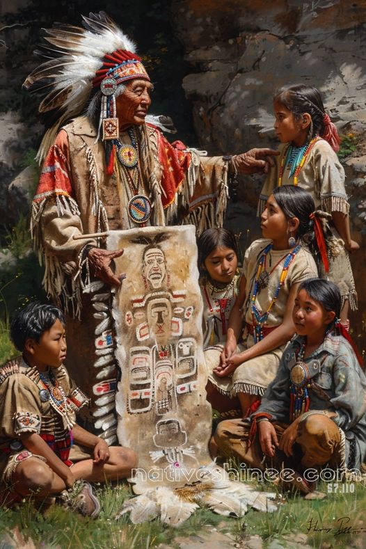 An elder, adorned in vibrant traditional regalia, sits with a group of young Native children, sharing the sacred stories of their ancestors. Holding a carved stone tablet with ancient symbols and faces, he points out key details, teaching the children the importance of their heritage and history. The children's eyes are fixed on him, absorbing every word with reverence and curiosity. The scene is filled with warmth and connection, as the legacy of the past is imparted to the future. The elder's voice is like the wind, carrying the wisdom of countless generations, ensuring that the stories of their people live on through these young hearts. The peaceful setting, with natural rock formations in the background, enhances the profound sense of tradition and cultural continuity.