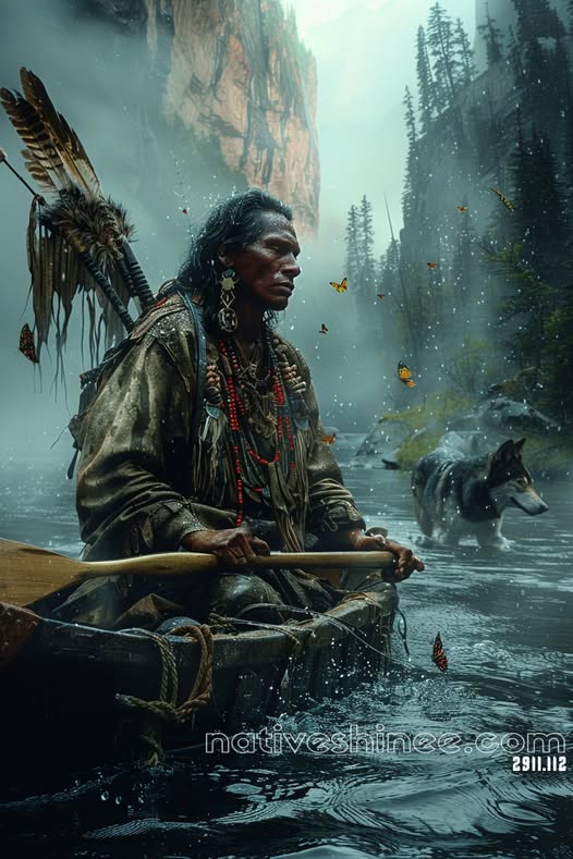 This "Wolf and Warrior" canvas print beautifully depicts a Native American warrior rowing his canoe along a serene river, accompanied by a loyal wolf. Surrounded by mist and fluttering butterflies, the warrior is adorned in traditional attire with intricate beads and feathers, symbolizing his deep connection to nature and spirit. The tranquil forest setting and the companionship with the wolf reflect the harmonious relationship between humans and the animal world. This artwork is perfect for those who admire Native American culture, nature, and the spiritual bond between all living things.