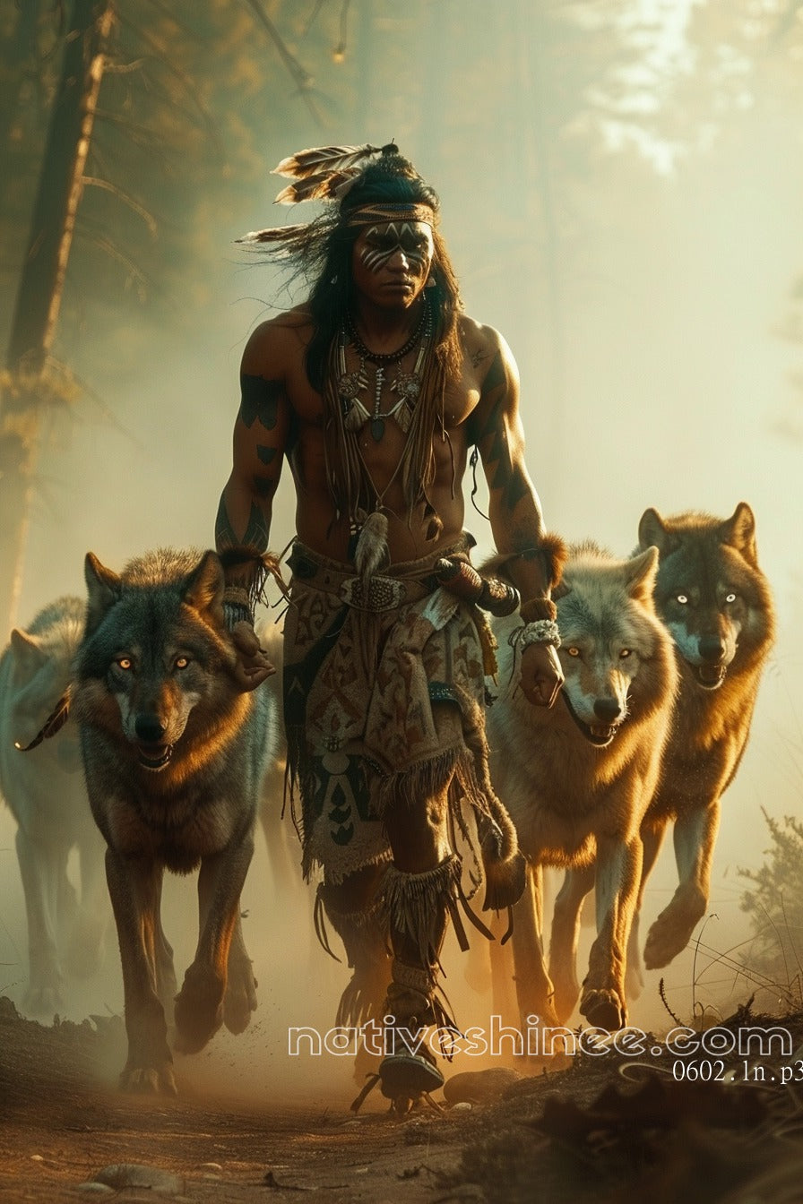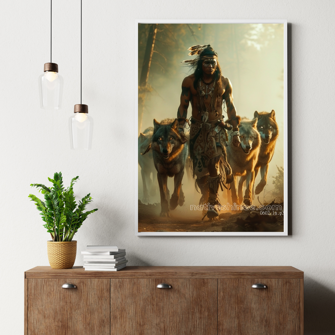 Step into the world of strength, unity, and ancient wisdom with this powerful canvas art, Wolf Pack Leader Native American Canvas. The image captures a Native American warrior, adorned with traditional attire and face paint, walking alongside a pack of fierce wolves through a misty forest. The warrior's connection to the wolves symbolizes leadership, loyalty, and the sacred bond between humans and the animal kingdom. This artwork is perfect for those who appreciate the deep spiritual ties in Native American culture and the untamed beauty of the wilderness, making it a striking addition to any collection.